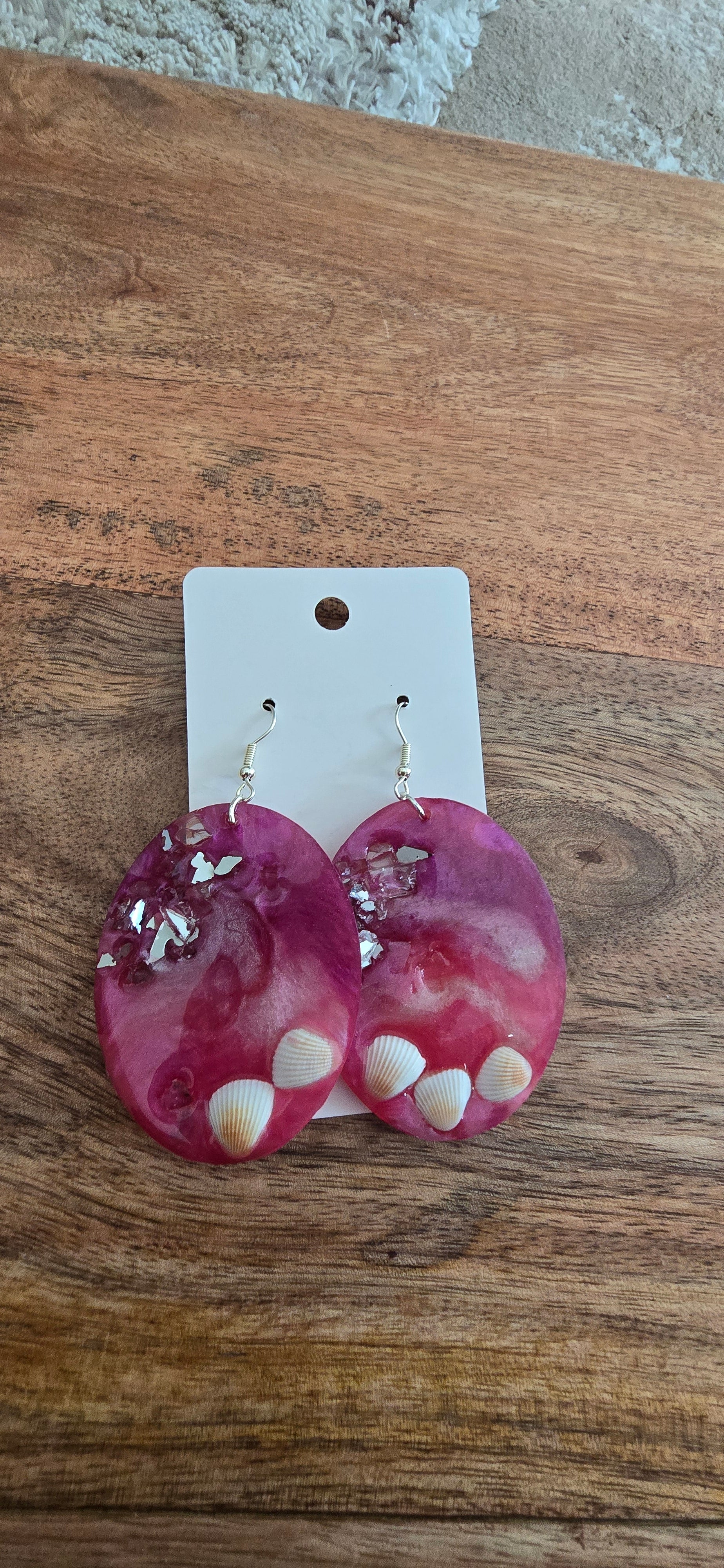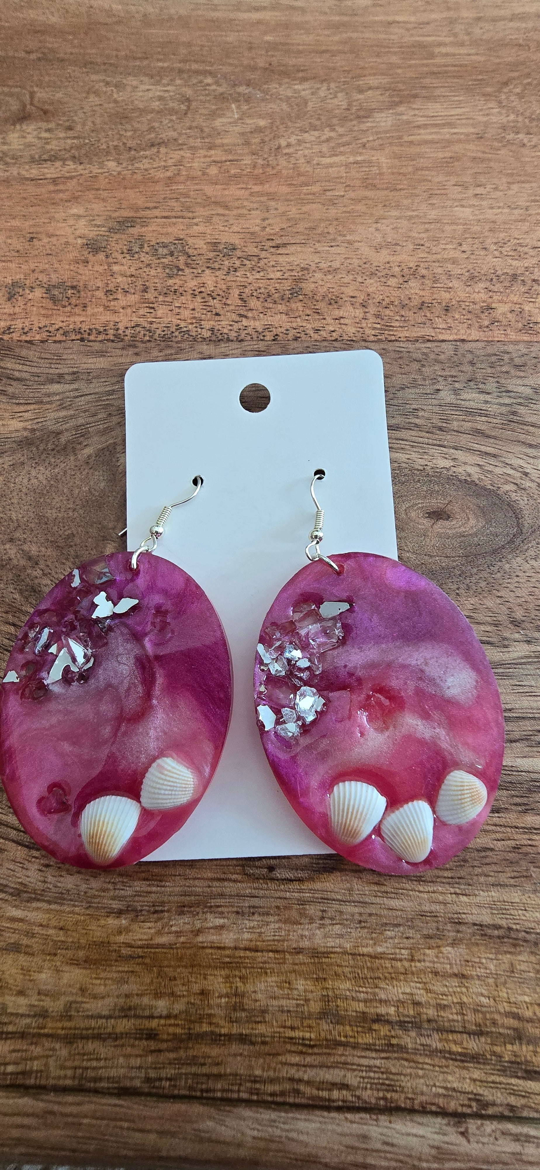 The smooth resin blends shades of rose, magenta, and soft blush, while the embedded shells rest at the bottom like they were gently washed ashore. Crushed silver-tone crystals add a sparkling highlight, giving the earrings a magical, ocean-kissed glow.